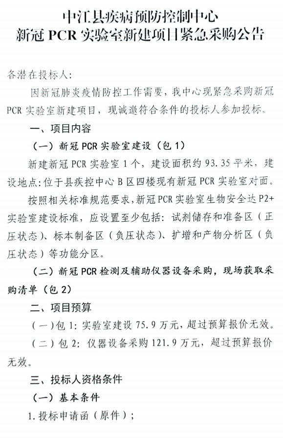 中江县疾病预防控制中心新冠PCR实验室新建项目紧急采购公告